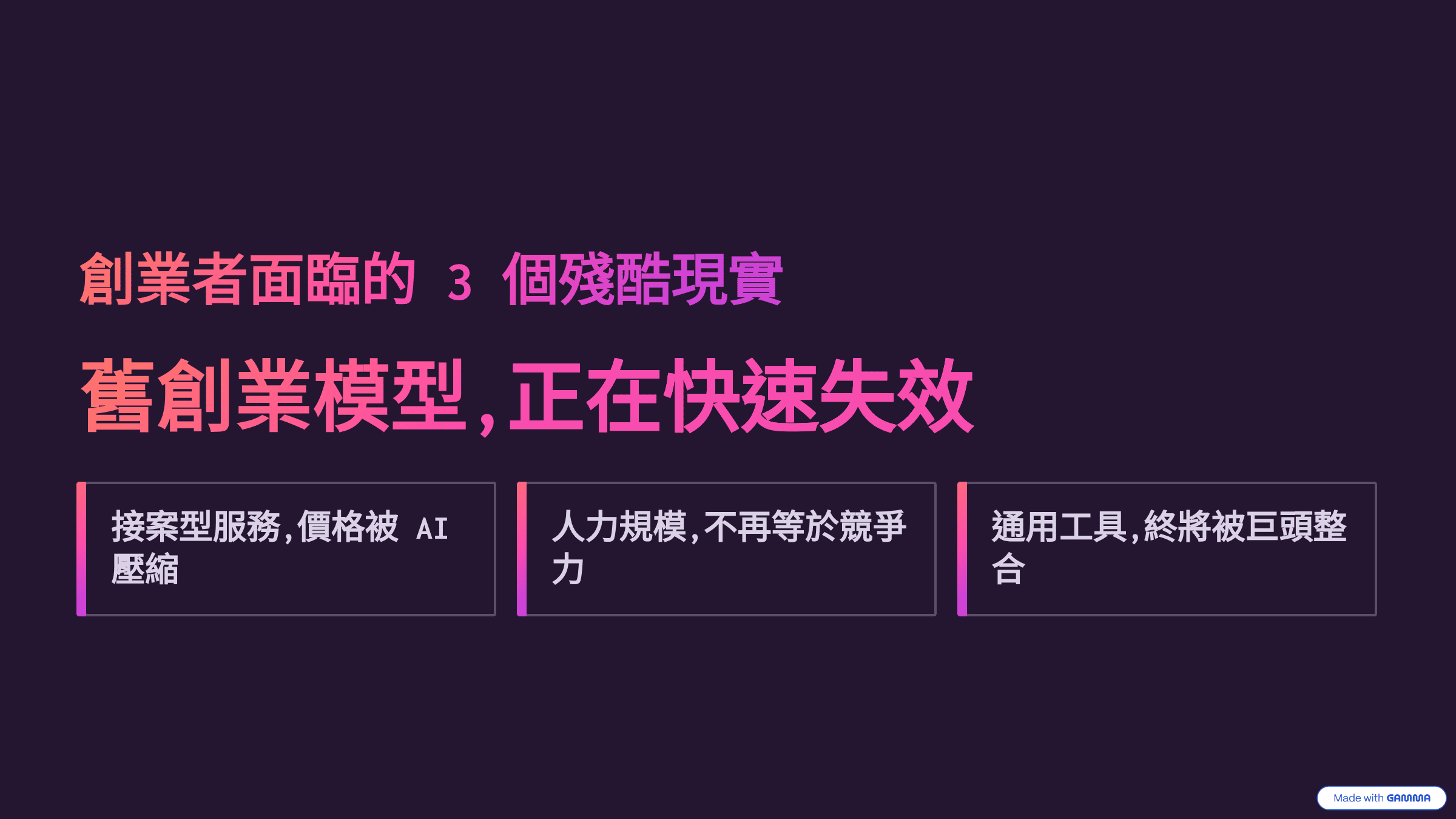 - 創業不再「人海戰術」,而是 AI-first 商業模型
